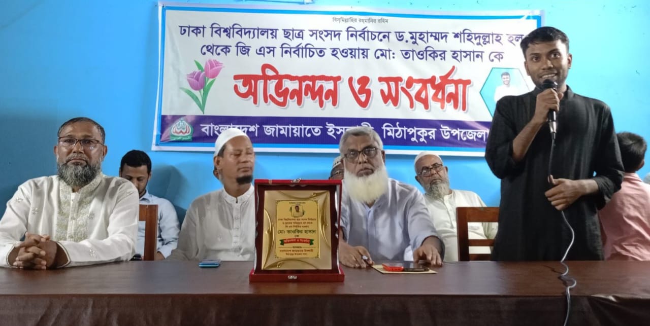 ডাকসু’র জিএস তাওকির হাসানকে মিঠাপুকুর উপজেলা জামায়াতের সংবর্ধনা