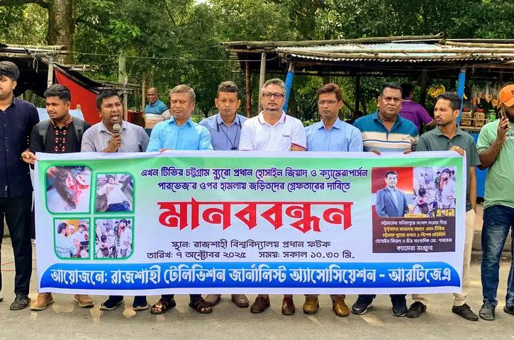সারা দেশে সাংবাদিক হত্যা-মামলা,গুম-খুন নির্যাতনের প্রতিবাদে-রাজশাহীতে মানববন্ধন